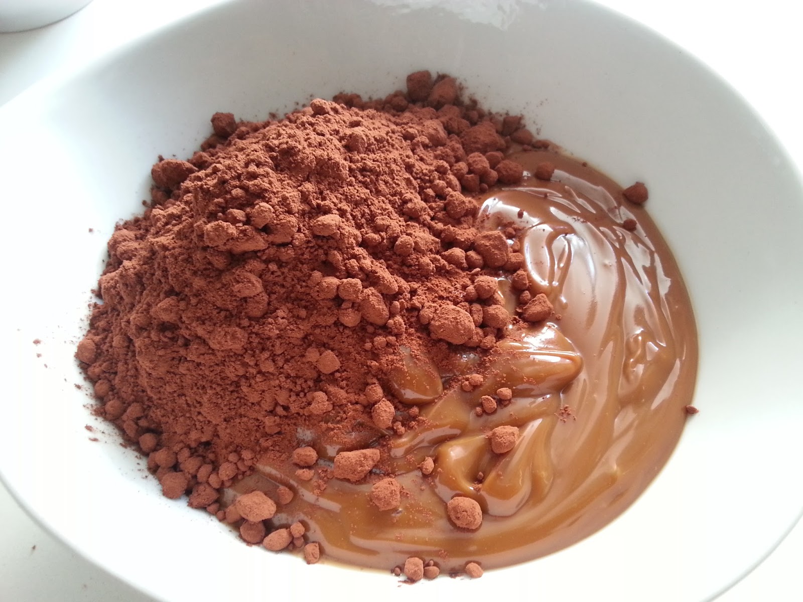 2. - Mientras está en el horno, echamos el dulce de leche en un bol, y le agregamos dos o tres cucharadas de cacao en polvo, y lo mezclamos bien.