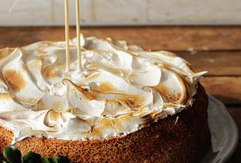 - para el merengue francés→. Bate las claras junto al cremor tártaro, hasta que monten ligeramente.Incorpora el azúcar glas tamizada y sigue batiendo hasta que se formen picos muy firmes .Con la ayuda de una cuchara, cubre la tarta. Con un soplete dora el merengue y sirve .