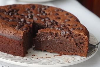 - Incorporamos la masa al molde, ponemos por encima las pepitas de chocolate. introducimos la tarta al horno, lo pondremos en el centro del horno. Lo tendremos unos 20-30 minutos o hasta que esté listo. La masa ha de quedar jugoso.