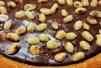 Incorpora la ganache de chocolate de forma uniforme. Aún estará tibia. Por tanto, será fácil. Reparte los cacahuetes por encima y espolvorea un pelín de escamas de sal.