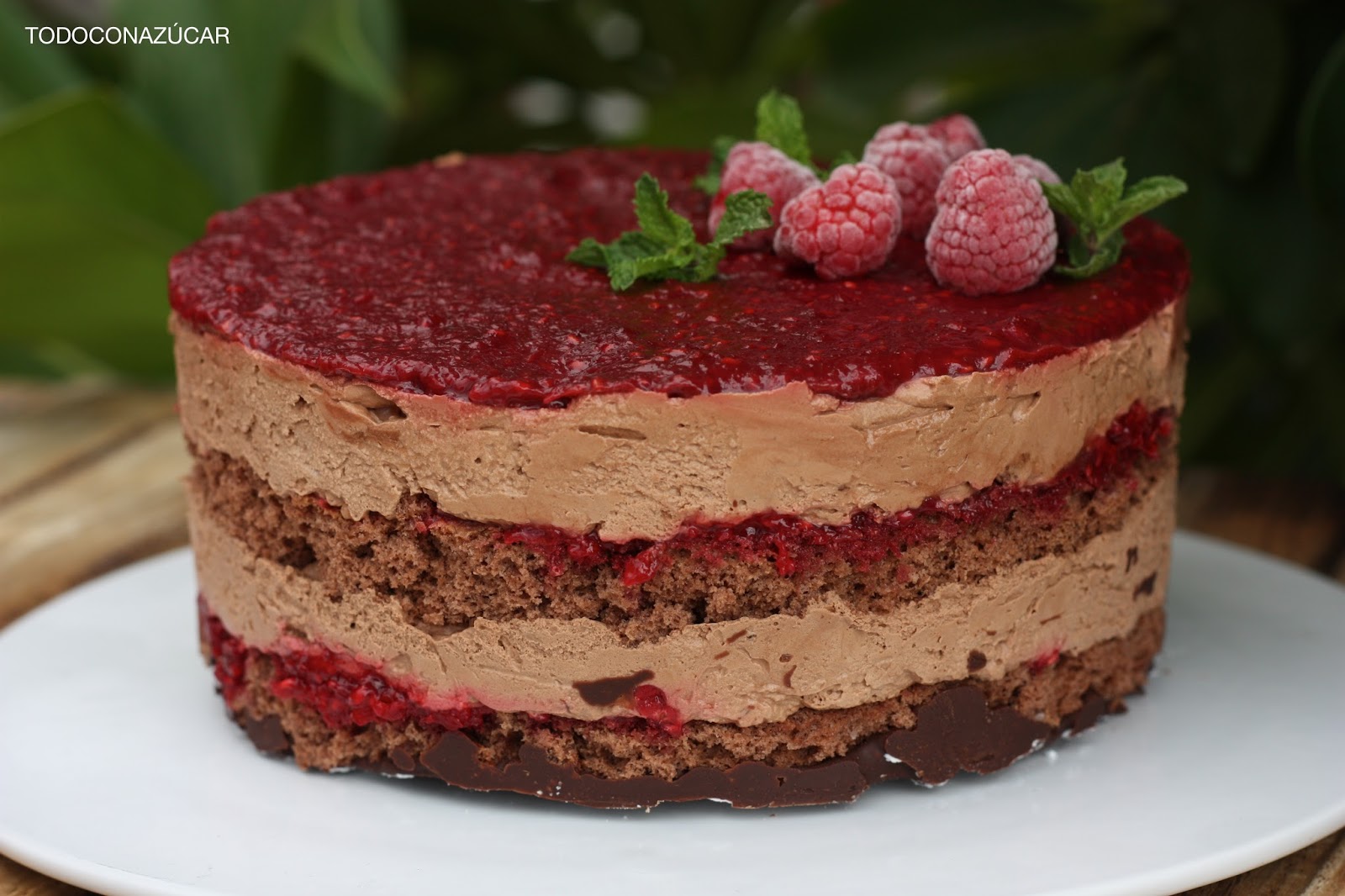 Tengo verdadera adicción por el chocolate y la mezcla con la frambuesa es una de mis combinaciones favoritas. Esta tarta lleva esos dos ingredientes y el resultado fue una tarta cremosa y suave con un intenso sabor a chocolate y el contraste de la acidez de la frambuesa.Tengo que avisar que no se trata de una carta fácil de hacer ni que se haga en un momento en esta ocasión lleva un poco mas de dedicación pero el resultado la verdad es que merece la pena y un poquito de paciencia porque son varios pasos.Como ves hice dos presentaciones, en una, la deje tal cual viendose el borde de las distintas capas, una presentación muy rústica y en la segunda opción opte por cubrirla con un baño de chocolate brillante y decorarlo con unos dibujitos una letra hecha con chocolate blanco.