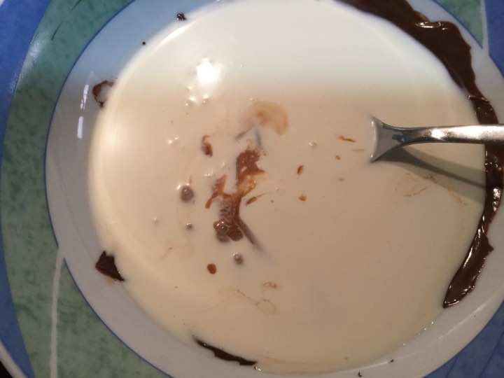 Derretimos el chocolate en el microondas, con cuidado de no quemarlo, en tandas de 40 segundos, sacando y mezclando para que se vaya derritiendo con el calor residual.
