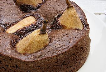 Precalentaremos el horno a 180º con calor arriba y abajo. Mientras derretiremos, al baño maría, la mantequilla y el chocolate y dejaremos templar. Mezclaremos las yemas con el azúcar hasta conseguir una mezcla homogénea. Añadiremos a esta masa el chocolate y la mantequilla. Montaremos las claras a punto de nieve. Incorporaremos la harina tamizada a la mezcla del chocolate intercalando las claras sin dejar de remover con movimientos envolventes. Engrasaremos un molde circular y verteremos la masa repartiendo bien. Colocaremos las peras peladas y enteras en el centro de la mezcla. Hornearemos durante 40 minutos o hasta que lo pinchemos y el palillo salga limpio. Una vez horneado dejaremos enfriar en una rejilla y finalmente espolvorearemos con azúcar glass.