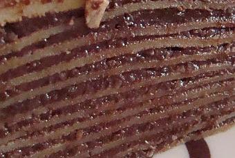 Para el montaje, sobre el plato he puesto un crepe, le he extendido 2-3 cucharadas de la crema de chocolate (no hay que poner mucha cantidad, solo la necesaria para cubrir todo el crepe) y he cubierto con otro crepe. He repetido la operación hasta terminar con los crepes o con la crema, teniendo en cuenta que la ultima capa tiene que ser de crepe. He espolvoreado el cacao sobre la superficie del crepe y he decorado con unas lascas de chocolate blanco, aunque también podría haber sido almendra laminada.