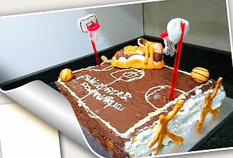 Esta es una tarta de cumpleaños de cancha de baloncesto de nata y chocolate. La bamba está elaborada con fondant al igual que los balones y los jugadores.INGREDIENTES PARA EL BIZCOCHO:10 huevos XL 500 g de harina de fuerza500 g de azúcar500 ml de nata20 gr de levadura200 gr de aceite de olivaUna pizca de sal Unas gotas de vainilla liquida