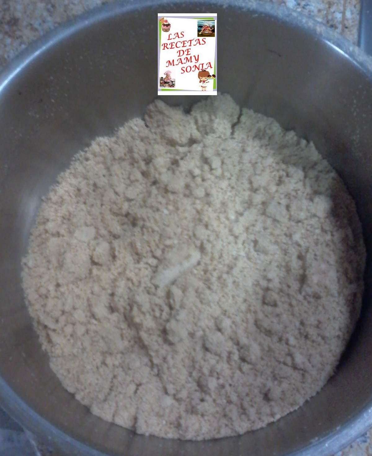 A continuación ya que nuestra tarta esta cuajada pasamos hacer la crumble para ello desmenuzamos el donut que nos queda y las 10 galletas y lo incorporamos a la superficie de nuestra tarta.