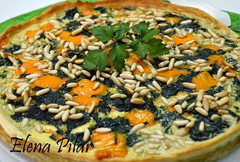 Una tarta salada de verduras muy fácil con la que obtendréis un plato bien completo y sabroso. La receta pertenece al programa Karlos Arguiñano en tu cocina. La he hecho prácticamente igual a la que podréis encontrar aquí. La única variación que he introducido ha sido el espolvorearle unos cuantos piñones sobre su superficie antes de meterla en el horno. Los piñones son uno de los frutos secos que más me gustan!!! Y, además, le van genial a las espinacas.