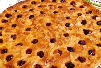 Retirar la tarta de frambuesas del horno cuando esté dorada y barnizarla con el glaseado de melocotón.