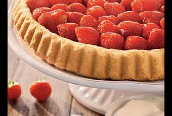 Mientras tanto, prepare el relleno. Lave las fresas y séquelas. Después límpielas y espolvoréelas con el azúcar. Distribuya las fresas sobre la base de la tarta. Prepare la gelatina para tartas según las instrucciones del envase y repártala uniformemente sobre las fresas.