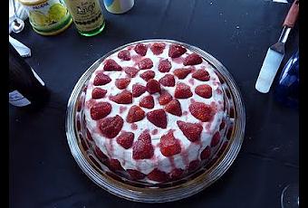 Finalmente se coloca el último piso, se emborracha y se cubre todo con la nata, procurando tapar los laterales de forma que quede totalmente cubierta.Por último se adorna con las caras exteriores de los fresones, procurando hacer círculos concéntricos, tanto la superficie como los laterales.