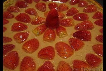 Ingredientes: - 1 lámina de masa quebrada - 1 kg de fresas- 400 grs para el relleno y el resto para decorar - 1/2 bote de leche condensada pequeño (unos 200 grs.) - 200 ml de nata líquida - 1 cucharada de maicena - 3 huevos - mermelada o brillo para tartas.