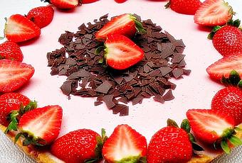 - Una vez firme, retiramos del molde y decoramos con el chocolate y alguna fresa alrededor de la tarta.