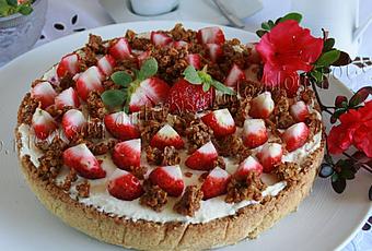 - Cuando se vaya a servir la tarta, cortar las fresas por la mitad a la larga, colocarlas por encima de la crema y esparcir la avena caramelizada.