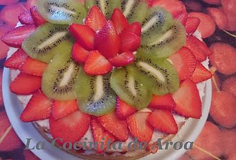 Por último, ponemos la última capa de bizcocho, echamos la nata sobrante y comenzamos a decorar de fuera hacia dentro alternando, un circulo de fresas y otro de kiwis, otro de fresas y y así hasta que no quede hueco libre.!!Servir fresquita!!Nota: ésta tarta para mi gusto está mejor de un día para otro ya que coge los sabores de las frutas y en el bizcocho quedan bien empapadas todas sus capas :P