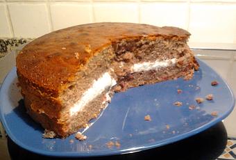Montar la nata junto con el azúcar y rellenar la tarta. En el caso normal sería rellenar y cubrir la tarta.... pero al gusto...