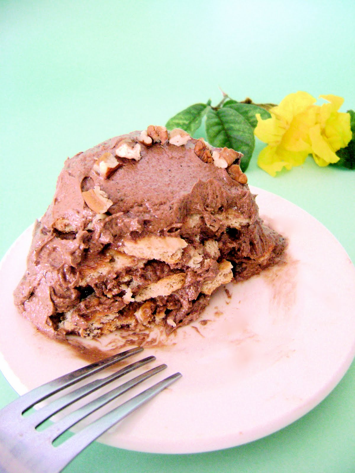 Sobre una capa de galleta, acrecentar una capa fina de crema de chocolate y sobre eso las nueces picadas. Hacer otra capa de galletas humedecidas, crema y nueces. Así sucesivamente hasta terminaren los ingredientes. Llevar a nevera por 1 hora (cuanto más tiempo mejor) y servir helado.