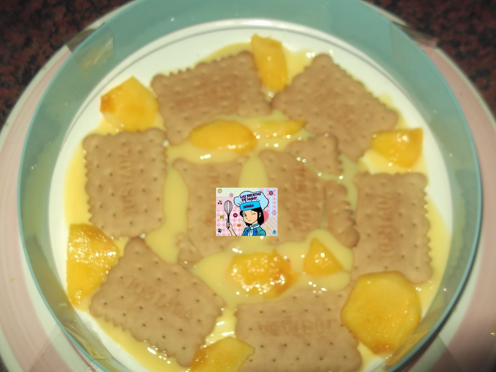 INGREDIENTES:_ 1 litro de leche_ 2 sobres de flan potax_ 6 cucharadas de azúcar_ 2 paquetes de galletas cuadradas o redondas tipo María_ Medio kilo de melocotones