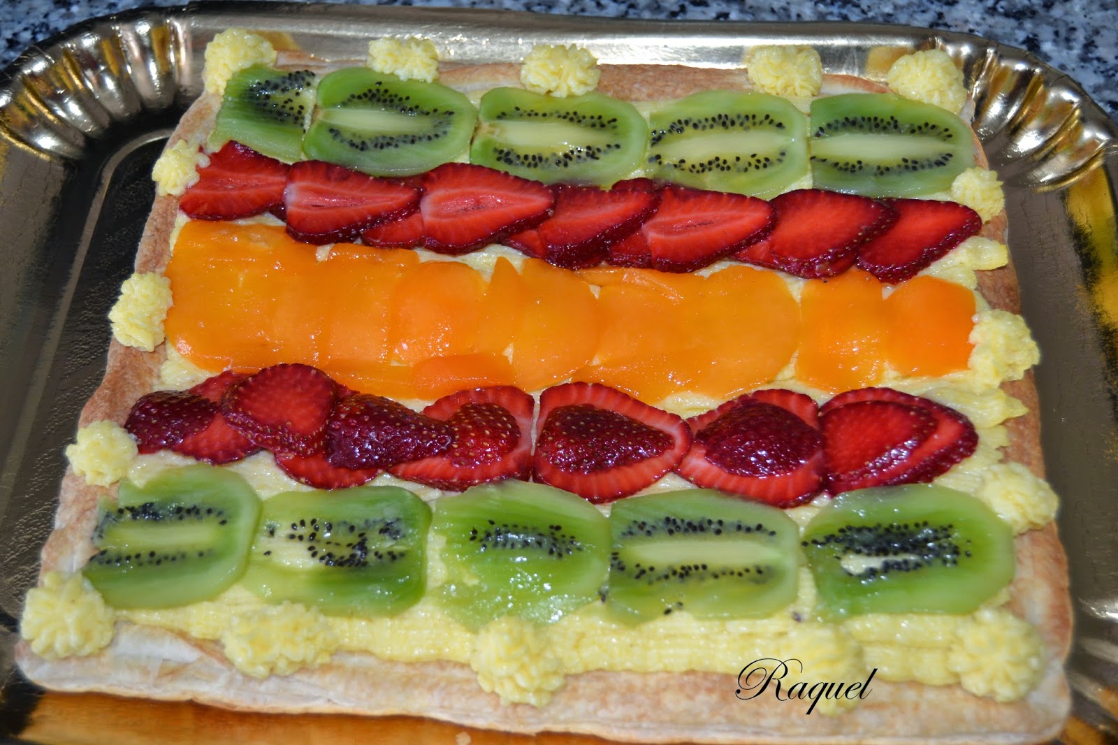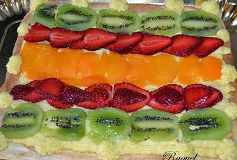 1 lamina de hojaldreFresasKiwiAlbaricoquePara la crema pastelera:100 gr. de azúcar500 ml. de leche3 yemas de huevo50 gr. de maizenaCorteza de limónUna rama de canelaPara el brillo:1 hoja de gelatina1 cucharada de mermelada de melocotón1 vaso pequeño de aguaPreparación:Preparamos la crema pastelera, ponemos la mitad de la cantidad de leche en el fuego con la canela y la corteza de limón, cuando este a punto de hervir retirar del fuego.Con la otra mitad de leche que reservamos, la mezclamos con la maizena , el azucar y las yemas de huevo mezclarlo todo y agregarlo a la leche caliente retirando antes el palo de canela y la cascara de limón.Poner al fuego bajo y remover sin parar hasta que espese la crema, reservar tapándola para que no se seque y forme costra.Precalentamos el horno a 180 grados.Extendemos la base de hojaldre y doblamos los bordes para que quede el borde quede mas alto.Pinchamos la base del hojaldre para que no suba, como en la foto.