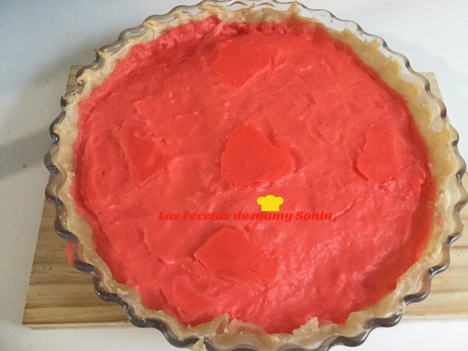 Hacemos la crema pastelera, tenemos que acordarnos de agregar unas gotitas de colorante rojo