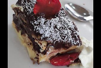 Añadir una última capa de galletas mojadas en leche y terminar con una capa de pudin de chocolate.