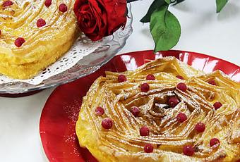 Tarta de griega de masa filo, para San Valentín. Súper crujiente por encima que contrasta con el rico flan del fondo.