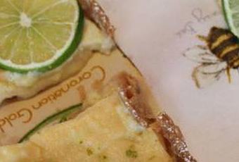 Dejamos que la masa se enfríe para posteriormente rellenarla con la crema que también estará fría. Adornamos con rodajas de lima y azúcar glass espolvoreada.