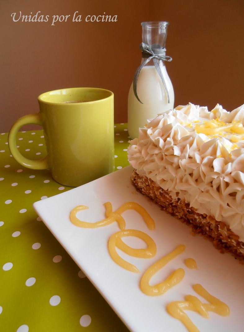 - Decoramos la superficie con ralladura de limón y escribimos las letras con lemon curd (debe de estar bien espeso) usando una boquilla redonda y de diámetro pequeño.