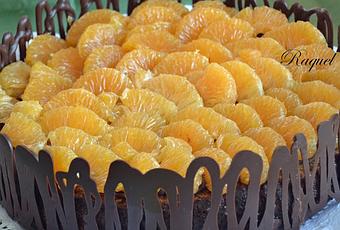 Pintamos alrededor del bizcocho los bordes con el chocolate, pasado unos minutos, ponemos el acetato sobre el borde del bizcocho presionando un poco suavemente y metemos en la nevera para que se enfríe totalmente y luego podamos desmoldarlo perfectamente.Pelamos el resto de mandarinas y aquí viene el peor rato de la tarta, hay que pelar los gajos sin que se rompan, pase un rato que no os imagináis porque se me rompían hasta que le pille el tranquillo, bueno gajo que se rompía gajo que me comía, así que preparar alguna mandarina mas, os aviso!!Cuando tenemos todos los gajos pelados, sacamos la tarta de la nevera y con mucho cuidado despegamos el acetato del chocolate y vamos poniendo los gajos sobre la base de la tarta poniéndole una gota de chocolate en la parte de abajo del gajo y así se pegara a la tarta.