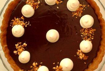 Llevar la nata y la glucosa a ebullición en un cazo. Retirar del fuego, añadir el chocolate picado y mezclar hasta que quede completamente derretido e integrado. Verter sobre la tarta y extender uniformemente. Refrigerar al menos una hora. Decorar con nata montada y cacahuetes picados y servir.