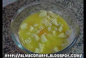 PREPARACIÓN 1. En un bol se mezcla la harina, la leche, el azúcar, el sobre de levadura, los huevos, la mantequilla (derretir previamente en microondas o a fuego lento) y 3 manzanas en trocitos.