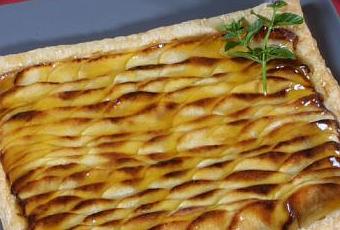 Espolvorea el hojaldre con un poco de harina y estíralo con un rodillo hasta que quede muy fino. Colócalo sobre una placa de horno forrado con papel de hornear. Con un cuchillo, corta los extremos de forma un rectángulo regular. Con un tenedor pincha la parte central para que no suba, deja los bordes sin pinchar.Pela las manzanas, córtalas por la mitad, retira los corazones y córtalas en láminas finas. Cubre la parte central del hojaldre, dejando libres los bordes.Coloca encima pequeñas porciones de mantequilla y espolvorea con edulcorante. Introduce en el horno a 170º - 180º durante 20-25 minutos.Retira la tarta del horno y unta la superficie con puré de albaricoque. Adorna con una ramita de menta y acompaña con salsa de frambuesas y unas natillas.Consejo