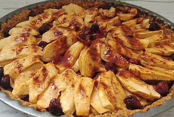 Para la base:♥100g de crackers de avena o galletas veganas♥1 taza de copos de avena♥3 cdas de margarina vegetal♥3-4 cdas de panelaPara el relleno:♥10 manzanas medianas♥2 cdas de canela♥3 cdas de panela♥1 puñado de arándanos secos♥zumo de limón