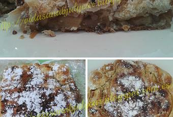 Abrir el hojaldre sin quitar el papel, en la mitad del hojaldre primero poner laminas de manzana, encima espolvorear azúcar, encima espolvorear canela en polvo y añadir trocitos de almendras, tapar con la mitad del hojaldre y cerrar los cantos, pinchar el hojaldre con un tenedor y espolvorear azúcar y trocitos de almendras(apretar un poco para que no se caigan), meter en la cubeta de laGM E con el papel( ver fotos de abajo) poner la tapa doradora y programar olla menú horno 150º, 15 minutos, tapa 250º, 20 minutos, sacar con ayuda del papel y dejar enfriarOs aseguro que tendréis éxito con esta tarta, esta riquísima
