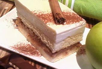 Relleno:Pelamos 3 manzanas Golden, y las rallamos en el rallador grande.Derretimos la mantequilla en un cazo, añadimos el azúcar, azúcar vainilla, la canela y las manzanas. Lo cocinamos a fuego lento hasta que se evapore casi todo el caldo.Crema:Mezclamos los huevos, el azúcar y el azúcar vainilla, la maizena con 100 ml de leche.Ponemos a hervir el resto de la leche.Cuando rompa a hervir añadimos la mezcla de la crema y la cocinamos hasta que espese, sin dejar de mezclar. Guardamos hasta que se enfrié, mezclando de vez en cuando.Montamos la nata y la guardamos en la nevera.Diluimos la gelatina en polvo en 50 ml de leche muy caliente y dejamos que se enfrié.Añadimos la crema pastelera -fría- a la nata, poco a poco, montando a velocidad media, y por ultimo la gelatina fría.Lo montamos todo, hasta que no queden grumos.Montar la tarta:Cortamos el bizcocho en dos a la larga.Colocamos una plancha de bizcocho en una bandeja y la cubrimos con el relleno de manzanas.Ponemos la otra plancha y, por encima añadimos con cuidado toda la crema de vainilla que nivelamos con una espátula de silicona.Guardamos la tarta en la nevera, unas 4 horas o una noche.A la hora de cortar; calentamos la hoja del cuchillo, en un vaso alto, la secamos con un trapo y cortamos la tarta. Podemos decorarla con canela o azúcar en polvo.