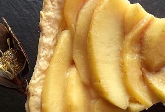 Un interior lleno de crema pastelera con vainilla y sobre él.. las manzanas confitadas...