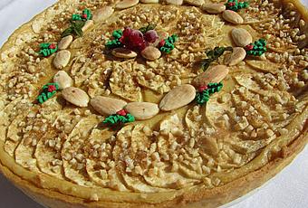 5- ACOMODAR LA MASA BRISE EN UN MOLDE ENGRASADO DE QUICHE, EXTENDER LA CREMA, CUBRIR CON LAS LÁMINAS DE MANZANA, ESPOLVOREAR CON ALMENDRAS, Y AZÚCARES.