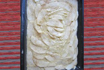 - en un molde enharinado y untado con mantequilla,ponemos la mitad de la ,masa y una capa de manzana golden delicious, echamos la otra mitad de la masa y terminamos con manzanas.