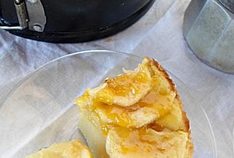 - La tercera vez quise probar cómo quedaría en el microondas. El resultado fue estupendo. Unté ligeramente con aceite de girasol un molde redondo de cristal apto, la dejé cocer 10 minutos y no la saqué hasta que se enfrió. La capa superior de las láminas de manzana queda más blanca que en el horno convencional, pero no importa, ya que después vamos a cubrirla con la mermelada o el brillo pastelero. Así que si sencilla es la ejecución de la tarta, encima en el micro, ya la facilidad es máxima.