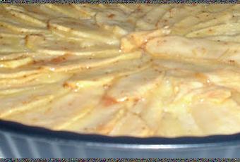 Engrasamos con mantequilla un molde para tartas tipo tartaleta, echamos la mezcla y encima colocamos las rodajas de manzana