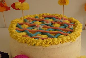 Decoramos poniendo encima de la tarta unas cenefas para formar un estampado con un dibujo a cuadros. Rellenamos a nuestro gusto el contorno.