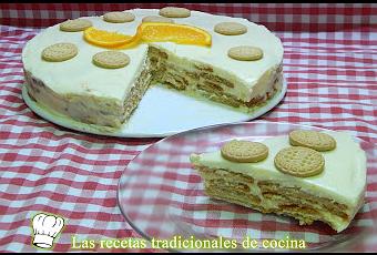 Cómo te estaba diciendo la elaboración es muy simple, ya que la mezcla de leche condensada, nata o crema para batir y el zumo del naranja, forman una crema espesa y muy sabrosa, que es ideal para hacer tartas, así que solo queda montar la tarta en capas de crema y galleta y listo. en cuanto se enfría bien queda un pastel compacto