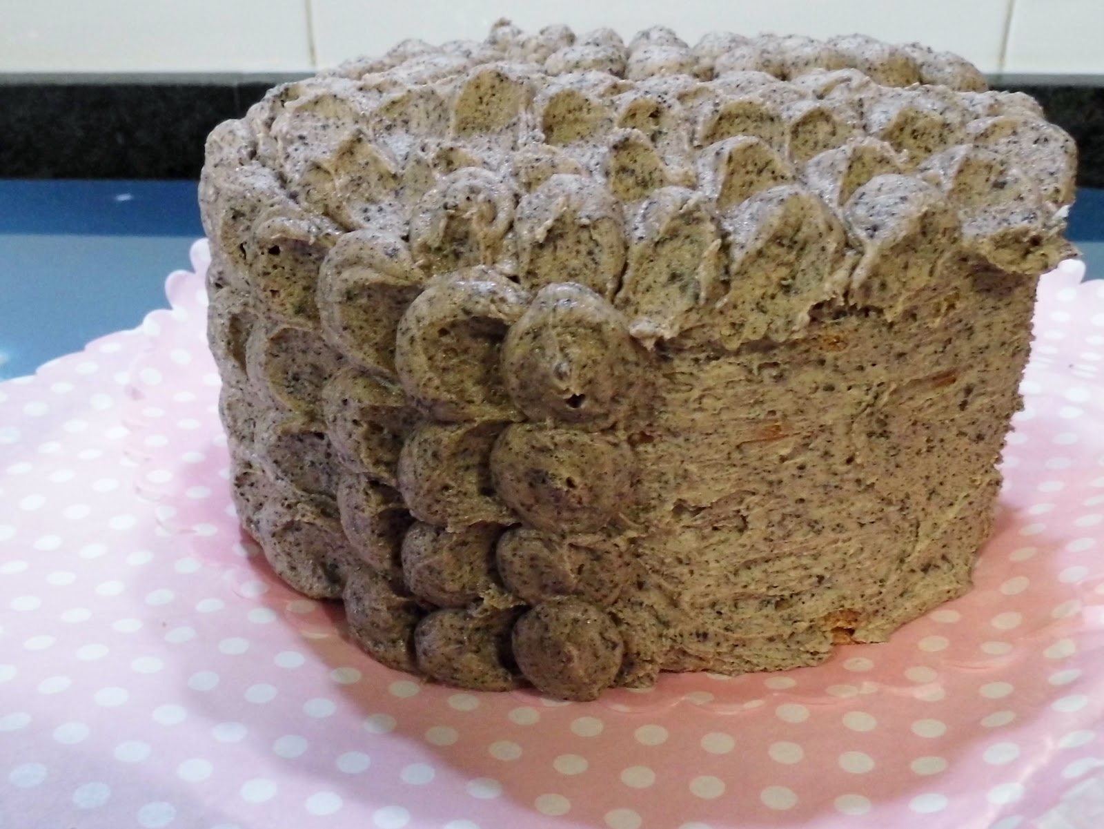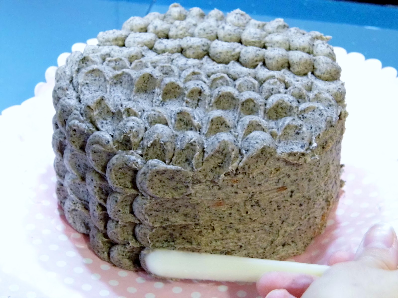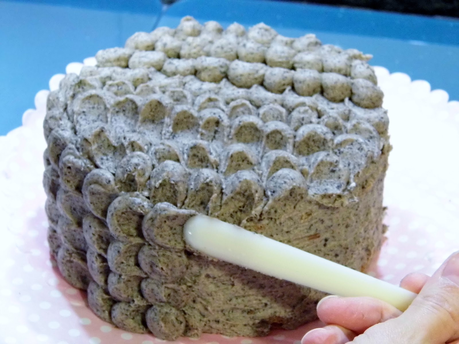 Primero y después de cubrir la tarta con la crema hacemos unas pequeñas bolitas de arriba a abajo