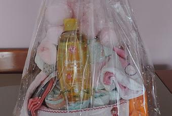 La tarta la he acompañado con un pijama, un body, calcetines, un babero bordado por mí a punto de cruz, puedes verlo aquí le he puesto también una mantita de estas con un muñeco que usan los bebés para dormir, también lleva la colonia, el champú, 2 paquetes de toallitas, y un peluche que es un unicornio rosa.