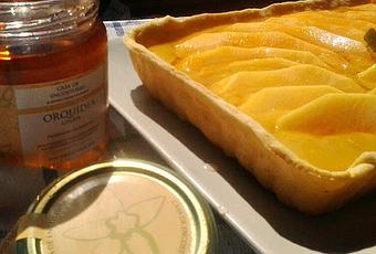 Es el momento de cortar la Papaya en laminas ...tiene que estar madura Montamos la tarta rellenando la base con la crema de limónPonemos encima los gajos de papaya entrelazados ...y por encima añadimos 2 cucharadas de jalea de orquidea ......
