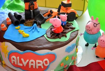 No traigo receta, hoy quiero enseñaros la tarta que he preparado para el cumpleaños de mi peke. Hace 4 añitos y quería una tarta de Peppa Pig, eso sí, con Peppa y George saltando en el charco de barro y las maquinas del Señor Bull haciendo un agujero para cambiar una tubería, así que me he puesto manos a la obra y este ha sido el resultado. Una tarta de Peppa Pig con diseño propio, el bizcocho es de vainilla y el relleno una buttercream de kinder. Lo único que no he modelado ha sido los muñecos que aprovechando que los teníamos de la caravana que le trajeron los reyes me ahorré el trabajito, je,je,je. Espero que os haya gustado, esta vesión de Peppa Pig.