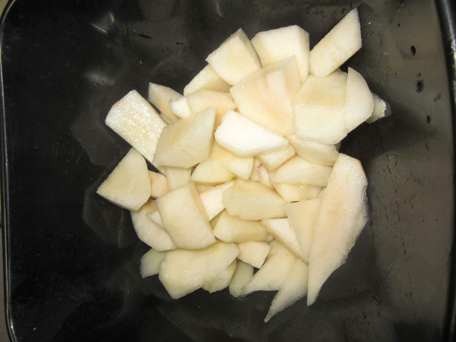 Ponemos en un molde engrasado y colocamos la pera fileteada por encima.