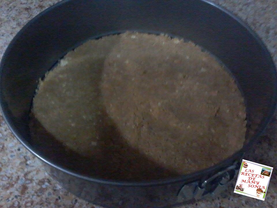 Trituramos las galletas, derretimos la mantequilla y mezclamos bien y echamos un pequeño chorrito de leche para que que nos quede mas jugosa pero sin pasarnos para que coja cuerpo y consistencia. Mezclamos muy bien y volcamos en el molde desmontable y repartimos por toda la base con a ayuda de una cuchara y aplanamos con la ayuda de un vaso, metemos al frigorífico.