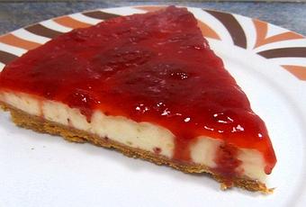 6.- Pasado el tiempo, la tarta ya habrá cuajado. Simplemente ponemos la mermelada de fresas, o la que más nos guste sobre su superficie, la extendemos bien para que la cubra toda, desmoldamos y ¡Voilá! ¡Tarta de queso terminada!