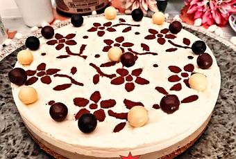 Yo con una plantilla que tenía le he hecho la decoración (también podéis hacer una plantilla con papel) he utilizado el cacao tamizándolo sobre la plantilla y le he puesto las bolitas de chocolate.