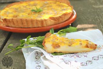 Ingredientes:Una plancha de masa quebrada100 gr. De crème fraîche (nata fresca)500 gr. De queso crema30 g. de azúcar2 huevos1 limón30 gr De harina1 cucharadita de esencia de vainilla100 gr de foie “mi cuit”100 gr de jamón en taquitos200 gr de mermelada de higos